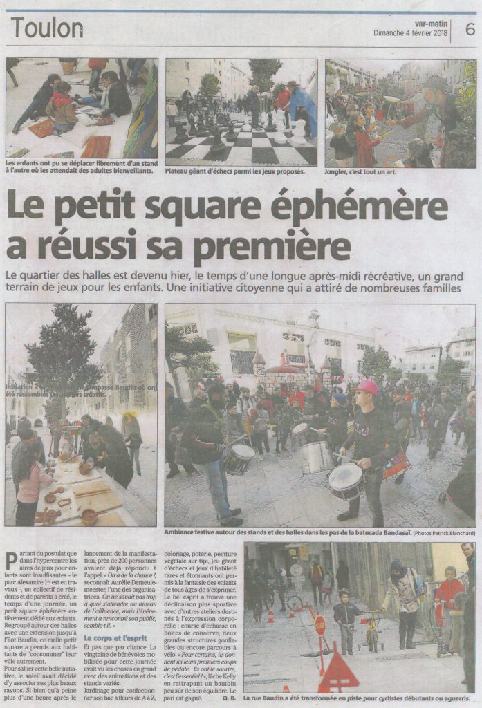 Mon Petit Square Ephémère, qui s’est tenu à Toulon samedi 03/02/18 après-midi, a rencontré un succès au-delà de toutes nos prévisions et espérances : 20 ateliers, 50 bénévoles, plus de 1 500 personnes de tous âges réunies le temps d’un après-midi dans le Centre Ancien de Toulon !