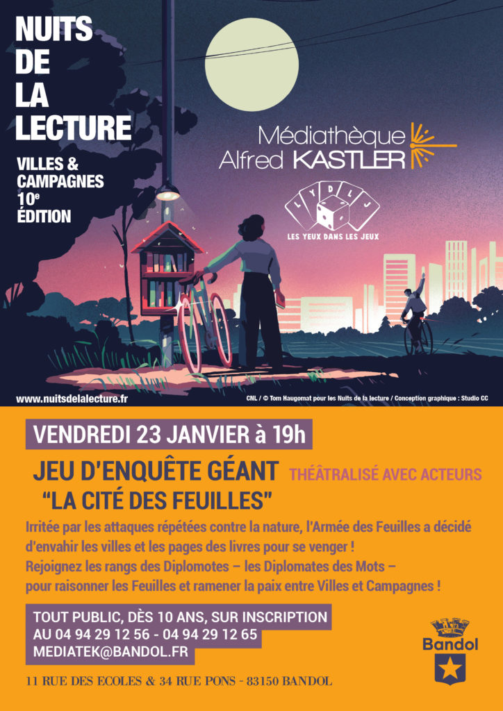 Ven. 23/01 – 19h-22h – Médiathèque Alfred Kastler (Bandol). Jeu d’enquête théâtralisé dans le cadre des Nuits de la lecture : La Cité des Feuilles. Sur inscription auprès de la médiathèque : 04 94 29 12 56.