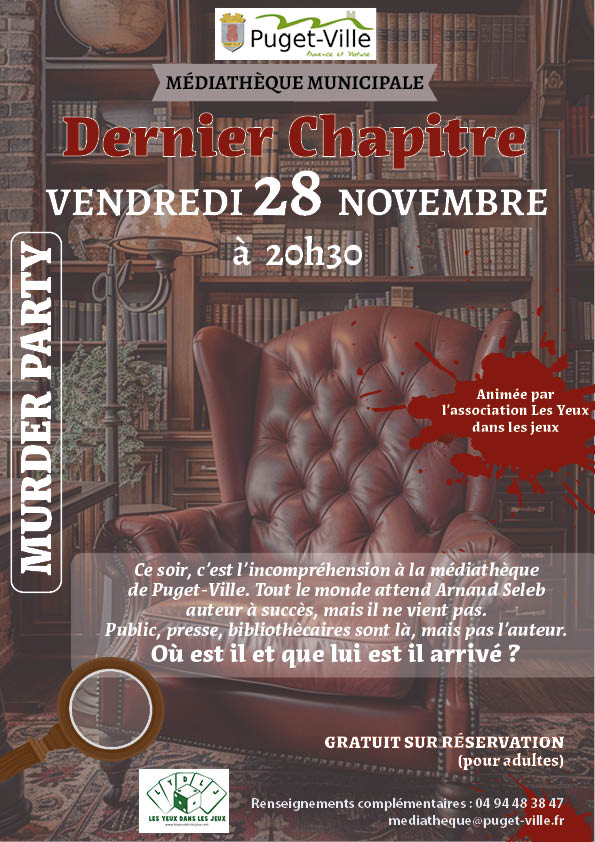 Ven. 28/11/25 – 20h30-23h30 – Médiathèque de PugetVille – Dernier Chapitre. Arnaud Céleb, l’auteur à succès, est attendu à la médiathèque pour une rencontre avec son public. Mais l’heure tourne et il n’arrive toujours pas… Où est-il passé ? Inscription : 04 94 48 38 47