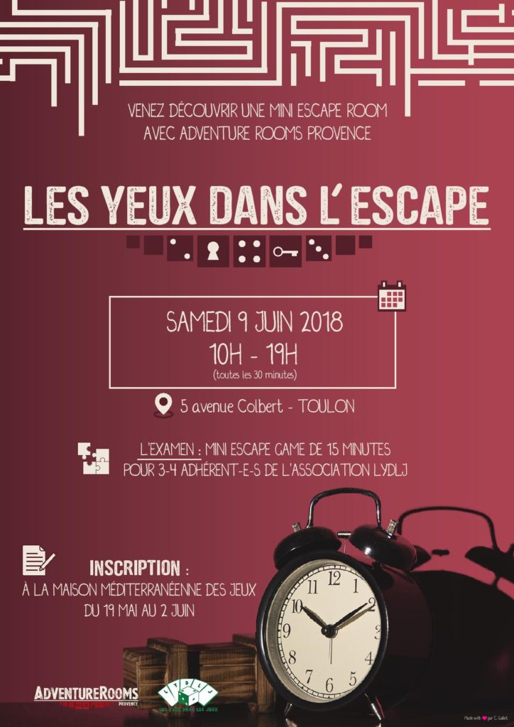 Samedi 9 juin 2018, dans le cadre d’un partenariat exceptionnel avec AdventureRoomsProvence, nous vous proposons une journée spéciale Les Yeux dans l’Escape. Toutes les 30 minutes, de 10h à 19h, une groupe de 3 ou 4 joueurs-joueuses adhérent-es de notre association pourra découvrir le mini-scénario d’escape game L’Examen, dans le 2ème local d’AdventureRoomsProvence (5 av. Colbert).