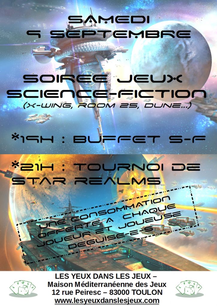 Au programme : un buffet (S-F, forcément !), des jeux dans le thème (Dune, Room 25, King of Tokyo, Terraforming Mars, X-Wing, Ad Astra, Galaxy Trucker, Cthulhu Wars… la liste est longue !!) est un tournoi de notre jeu du moment : Star Realms !